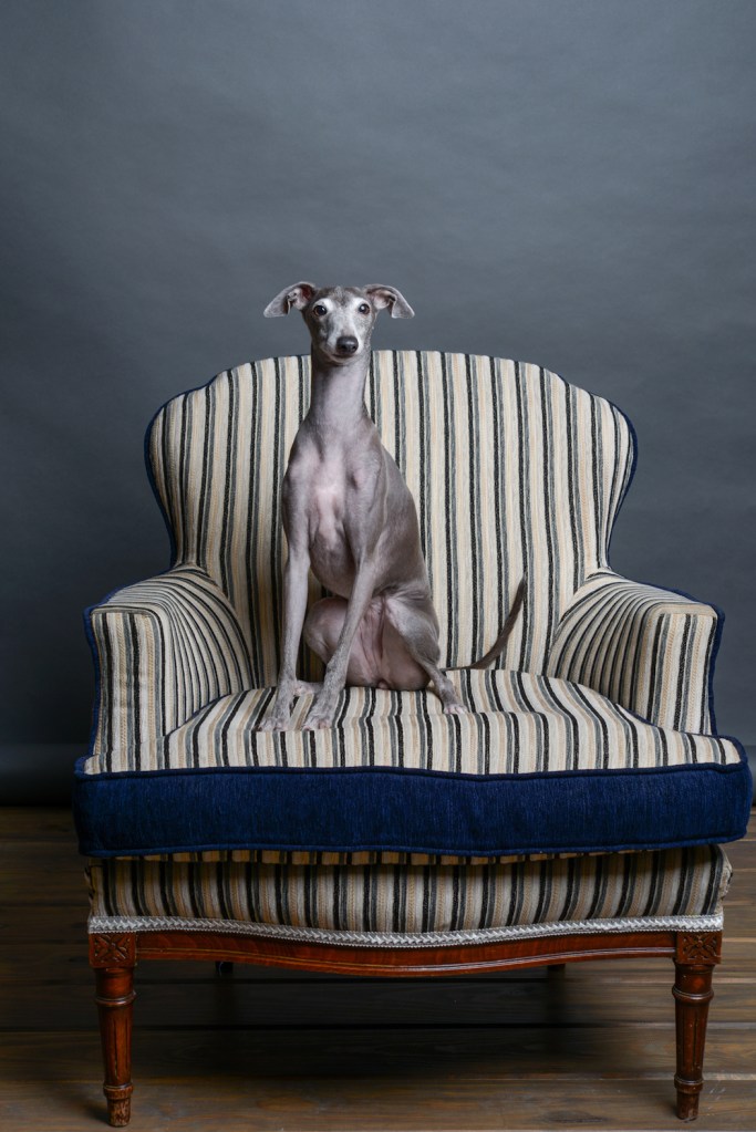 Retrato en estudio de perros. Galgo italiano en butaca clásica. Iluminación de estudio. Captar su esencia.