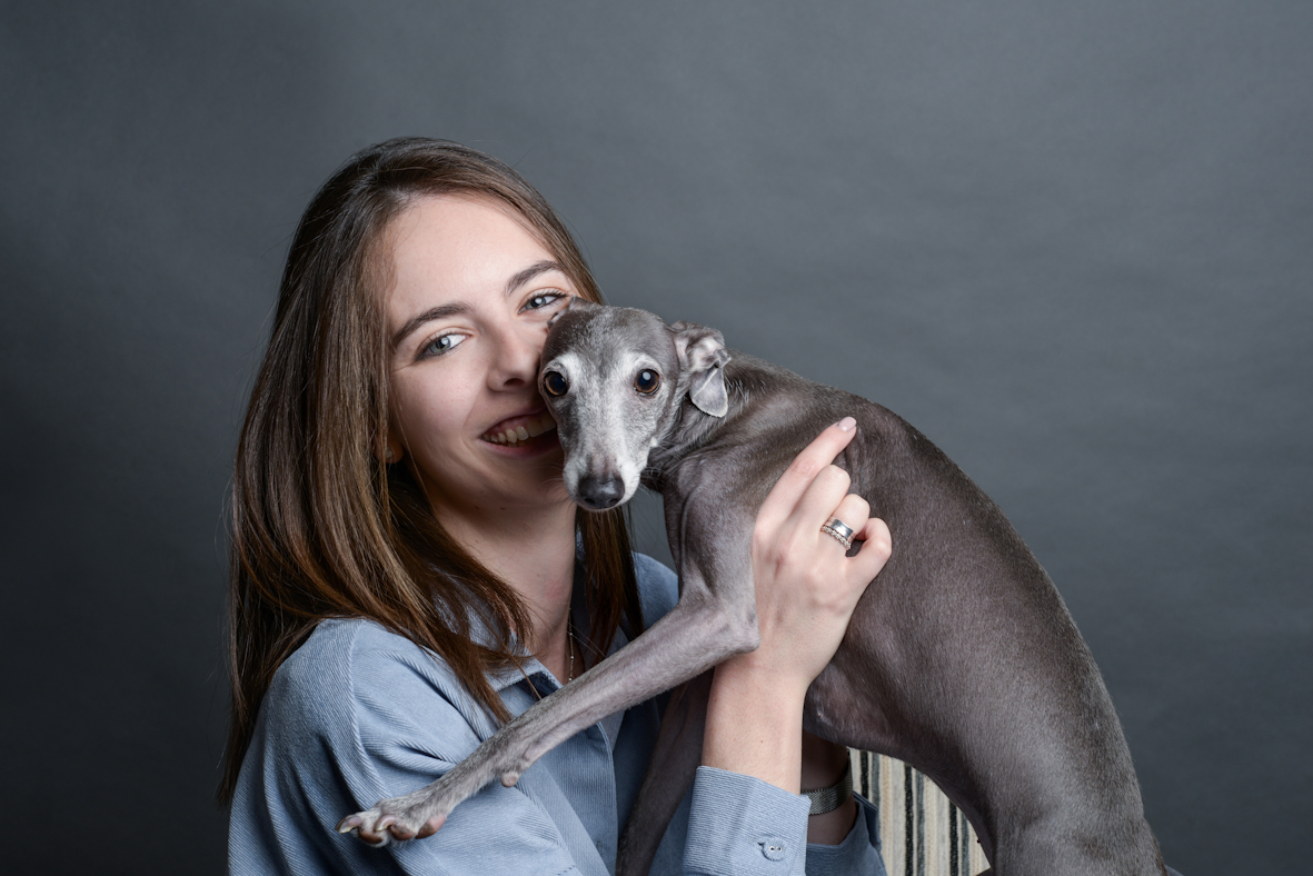 /Studio portrait of the Carlota & Joy, a precious italian greyhound.